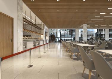 餐廳以樸素?zé)o華的原木材料裝飾墻面,時(shí)尚大方,搭配暖黃燈光、原木色和淺灰色的皮座椅,營造溫暖干凈、自然質(zhì)樸的就餐環(huán)境,能夠同時(shí)滿足度假與商務(wù)需求??臻g布局則以自助餐臺(tái)裝飾、用餐區(qū)陳設(shè)的食盒、食材、器物等再現(xiàn)古臨安集市繁華的市井氣息。
